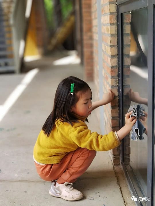你会看到,一两岁的孩子,够不着台面,也会踩着板凳,垫着脚尖洗自己的碗。每天吃完午饭,就会有大小孩子一起来清洁课室,他们把地板拖的干干净净、把窗户擦的闪闪发光,完了还不忘照照自己的小脸蛋!晚上,最热闹生动的画面在卫生间,孩子们边聊天边“洗刷刷”,有洗漱的,有打扫卫生的,还有努力搓着内裤袜子的……