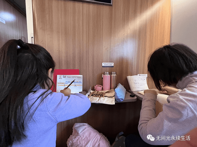 我们看到:我们的孩子们在酒店还有在高铁上,他们会利用一些空闲的时间、临睡的时间来进行他们的一个学习。