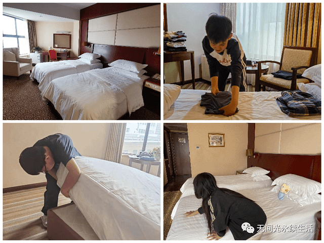 图片里面,孩子们在住酒店的时候依然是自己照顾自己的部分还是要做的:比如说叠衣服、整理床铺等等。