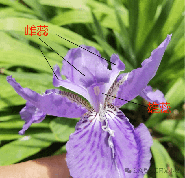 有没有遇到困难或者问题?因为正常角度下的鸢尾花的雄蕊紧贴在雌蕊的背面,我们一般情况下是看不到雄蕊的,被雌蕊挡住了。而鸢尾的雌蕊因为形状特化,和我们平时看到的雌蕊长的很不一样,即使在眼前我们一般也认不出来。笔者也是找了好久,后来到处请教别人,加上查资料才最终确定的。答案请看下图。观察雄蕊需要把花抬起来一个角度才行,雌蕊紧贴在雄蕊背后,和桃花,菊花等的雌蕊形状差别很大。